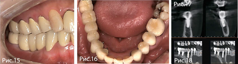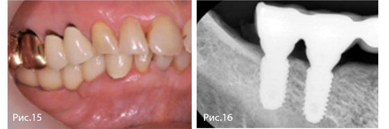 Рис. 15—16. Окончательное протезирование через 14 недель после имплантации. Отмечают благоприятное состояние мягких тканей в области вмешательства. Через один год уровень краевой кости и костная поддержка имплантатов стабильны.